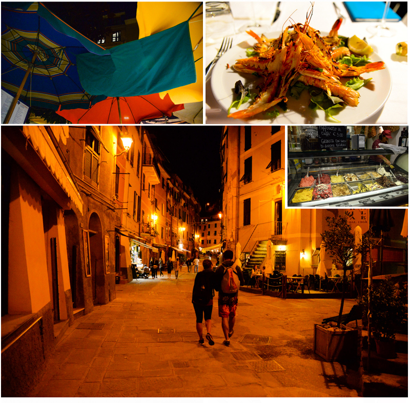 Dinner tonight after a shower and change is in a gorgeous outdoor restaurant. And the entire populace in the village seemingly heads out with us to dine in the quaint restaurants and nooks lining the cobbled streets. There are a dozen outdoor open air cafes under umbrellas. Seafood Salad for Sandra, Grilled Seafood for me. A bottle of Moscato. Bread and Olive Oil. Simple, but delicious fare. It’s €70,00 for the meals and wine and worth every Euro. Fresh Italian gelato, salted caramel and pistachio, wild berry and vanilla, at a shop on the trek back is a must.